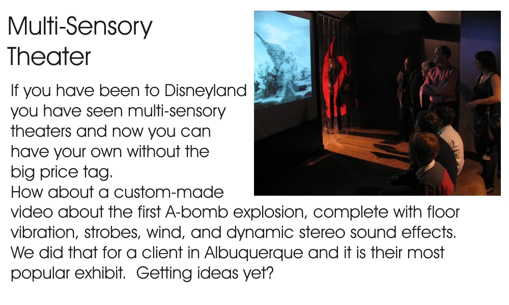 Take a look at photos from projects we did for the National Museum of Nuclear Science and History in Albuquerque and the 95th Bomb Group in Tucson. Lots of interactivity. Mouse over each one and click to see it larger.