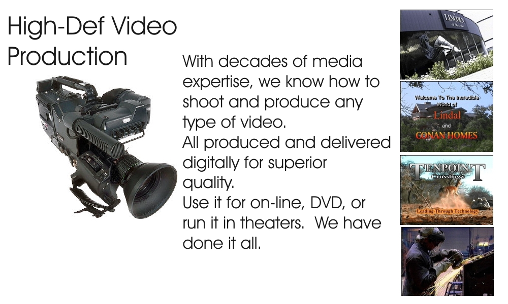 We have over 30 years producing television and all forms of electronic media. We create all projects in stunning high def.